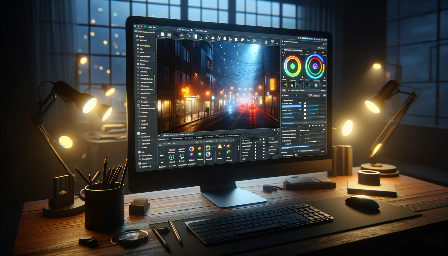 • Intensidad y Color de la Luz: Ajusta la intensidad y el color de las luces para reflejar las fuentes de luz artificial comunes en escenas nocturnas. Las luces a menudo tienen tonos más cálidos (amarillos/naranjas) o fríos (azules).