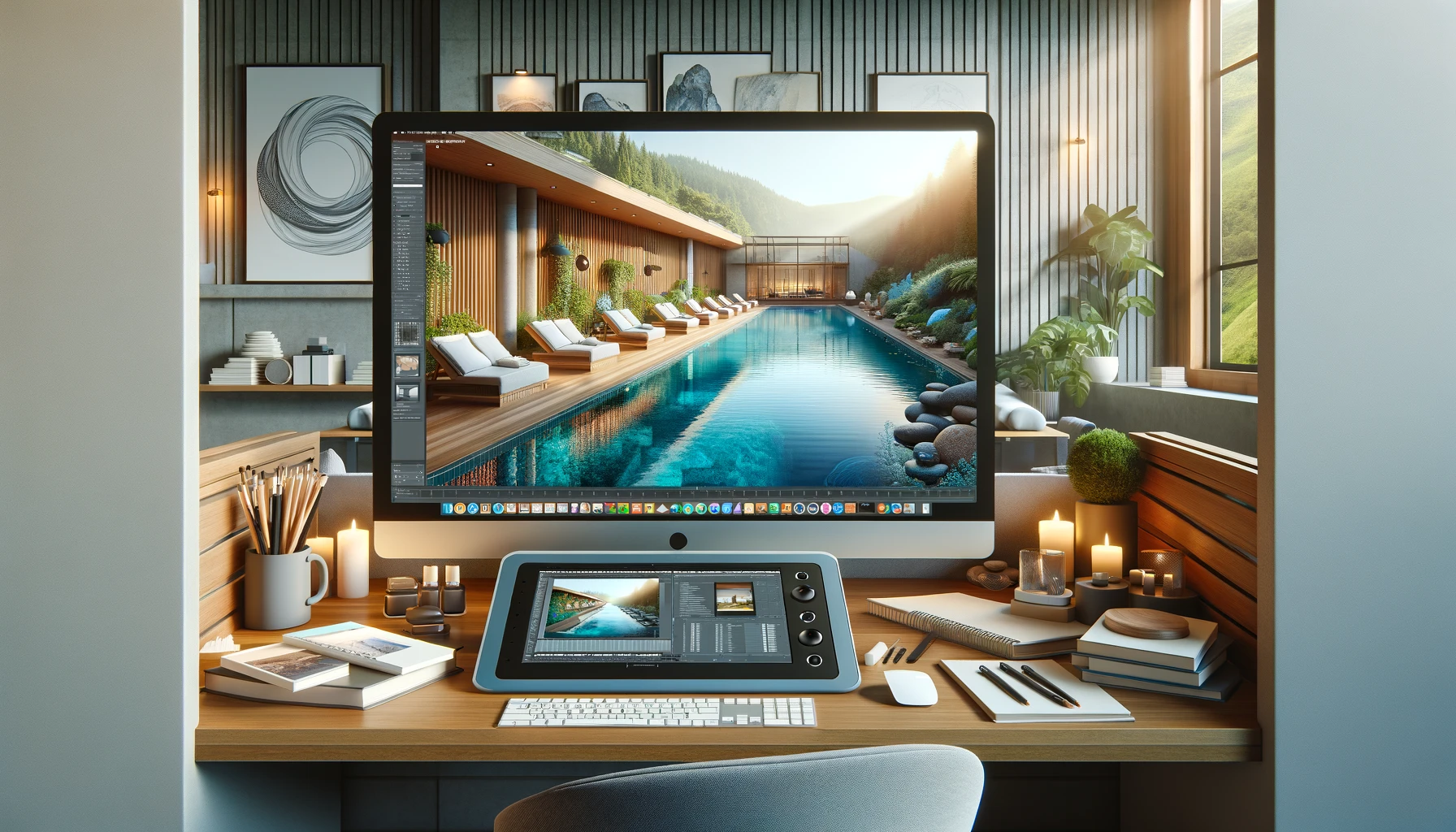 4. Texturizado y Materiales: Selección y creación de texturas y materiales que reflejen una sensación de calma y lujo, como madera, piedra natural, y telas suaves.